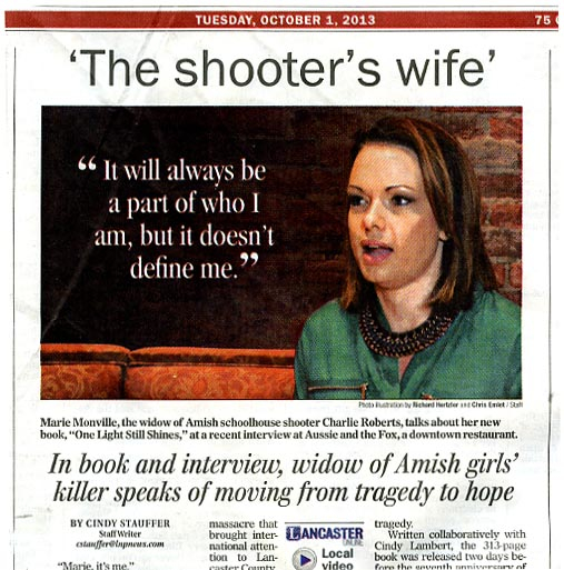 When I bring 5-pound bags of Wenger’s famous ham-loaf frozen from Pennsylvania to Florida, the plastic-coated tubs of meat are wrapped in newspaper and then shrink-wrapped in plastic. The wrapping on one of the packages (we need two to feed the clan now!) revealed the riveting story of Marie Monville, the widow of Amish school house shooter Charlie Roberts.