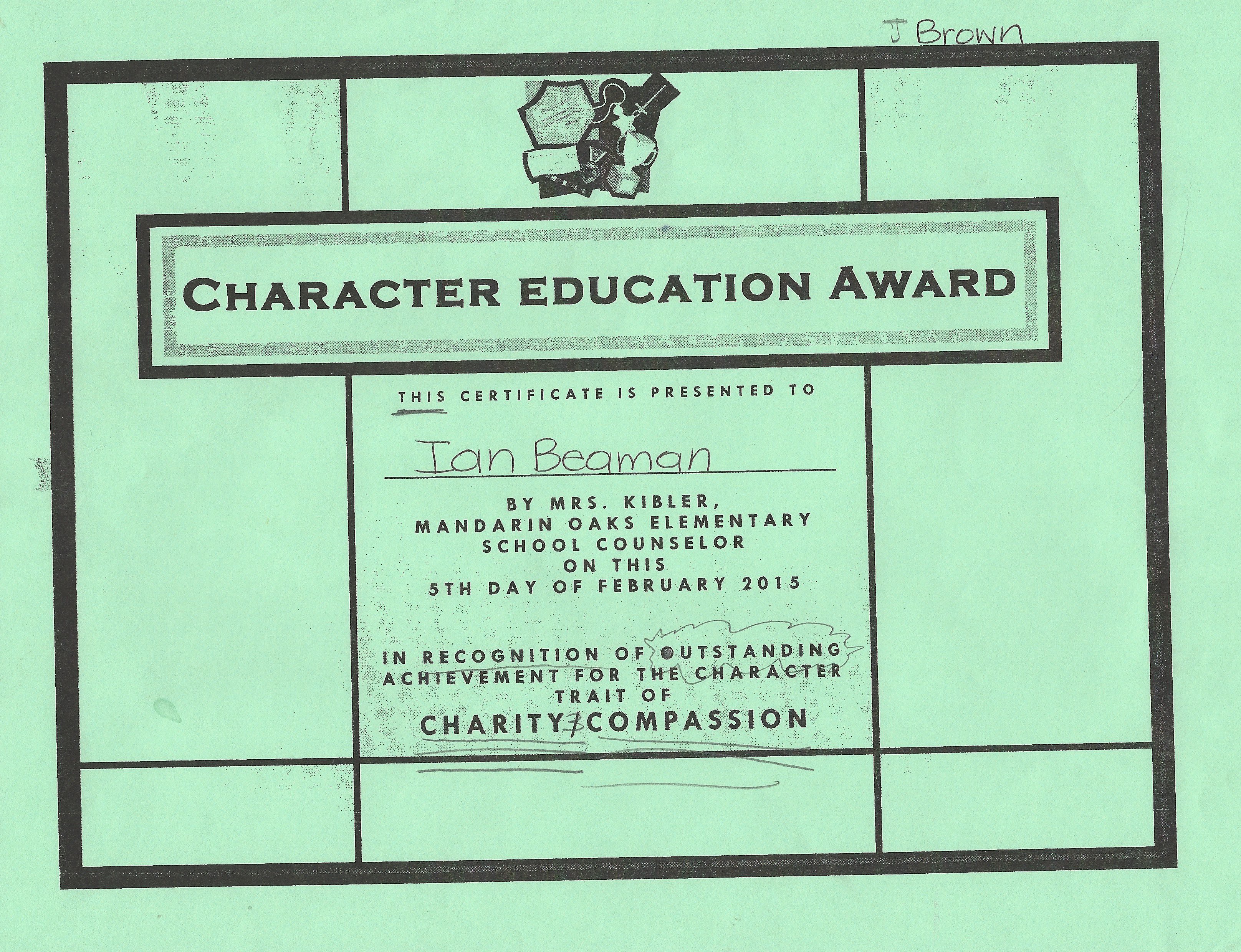 Ian: Character trait of Charity & Compassion. He also received a senior yellow belt, Tae Kwon Do