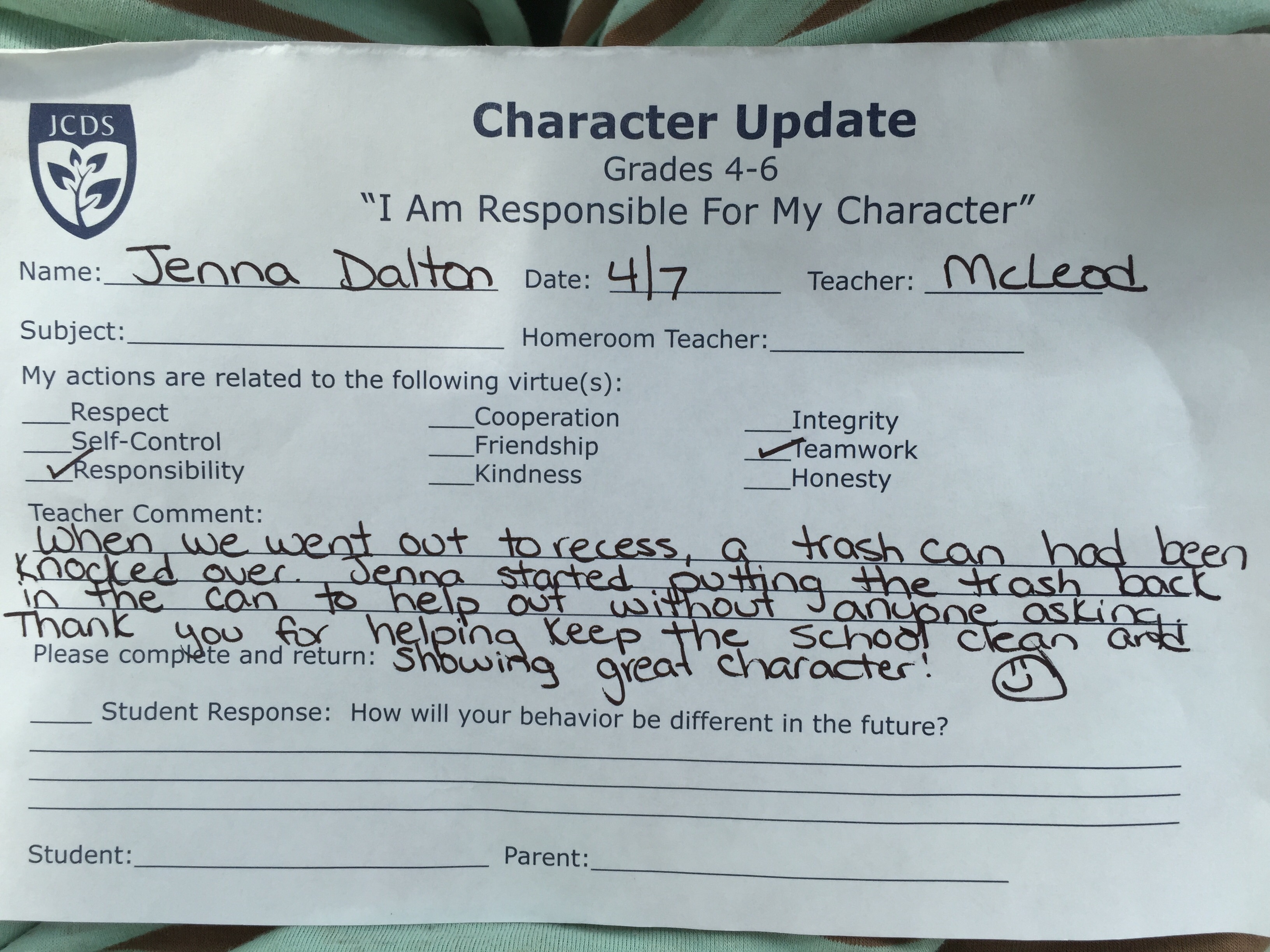 Jenna’s gift for noticing trash on the playground and stopping to pick it up at recess