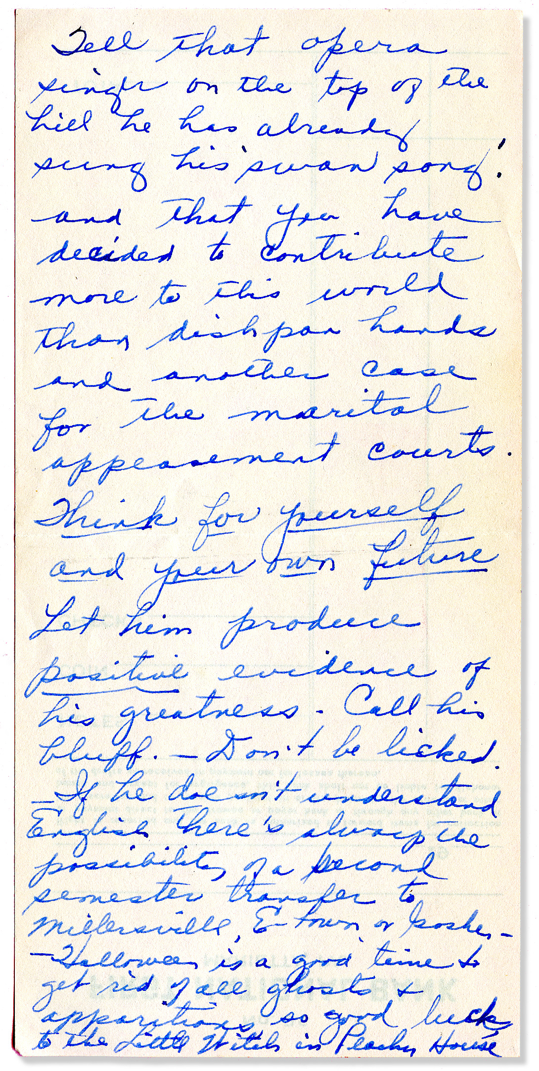 Tell that opera singer on the top of the hill he has already sung his “swan song” and that you have decided to contribute more to this world than dishpan hands and another case for the marital appeasement courts. Think for yourself and your own future and let him produce positive evidence of his greatness. Call his bluff. – Don’t be licked. If he doesn’t understand English there’s always the possibility of a second semester transfer to Millersville, E-town or Goshen – Halloween is a good time to get rid of all ghosts and apparitions, so good luck to the Little Witch in Peachey House.