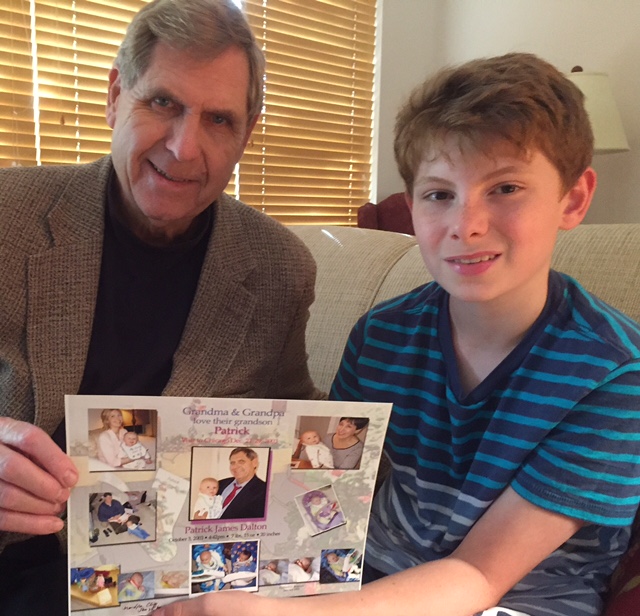Patrick and Grandpa, with matching lopsided grins, check out a photo collage