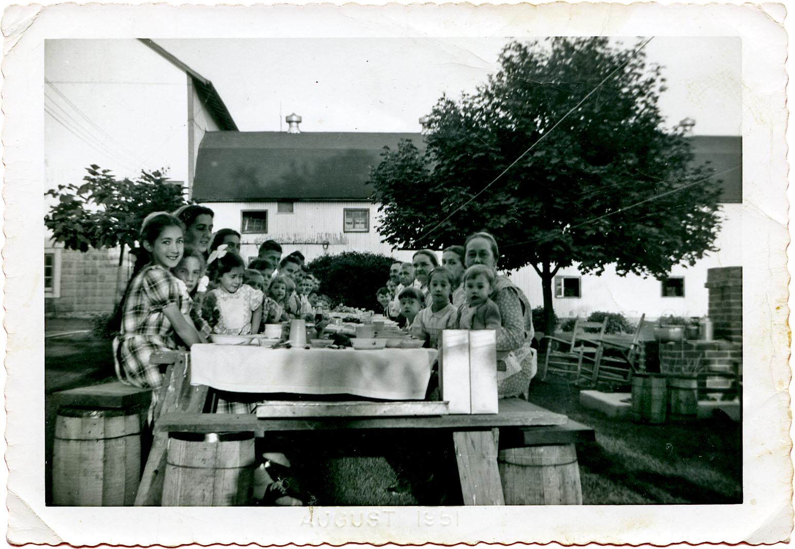 Uncle Leroy and Aunt Clara’s farm is the perfect place for a summer Sunday dinner on the lawn. Hefty barrels hold up this groaning board as we pass around the seven sweets and seven sours, every family bringing a dish to another Metzler reunion.