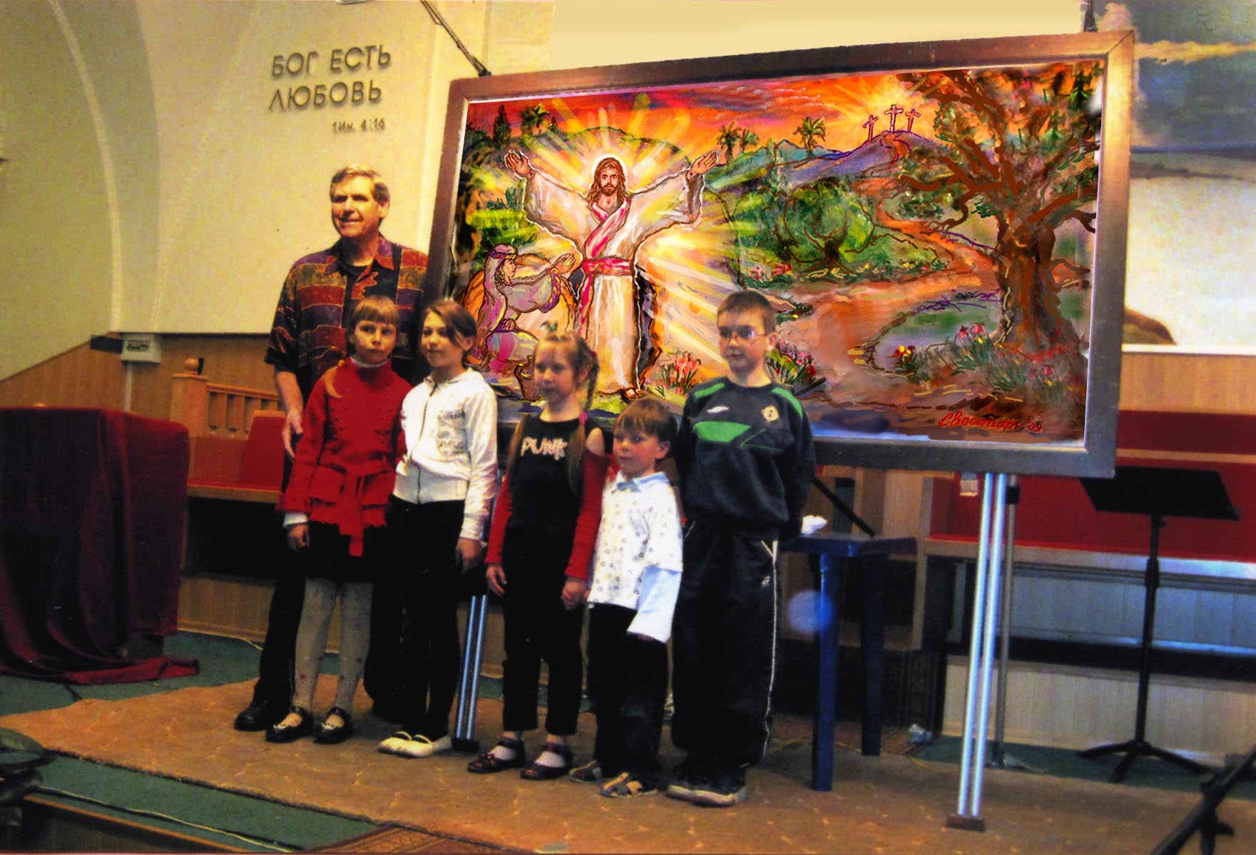 At the invitation of ABCLife, Kathy Gould’s ministry to children and families, husband Cliff and I spent two weeks in Kiev (April 8 – 28, 2011) and surrounding towns performing art and music shows in public schools and churches. His final program entitled “He is Risen” is presented here at Birth of Christ Church on Easter weekend.