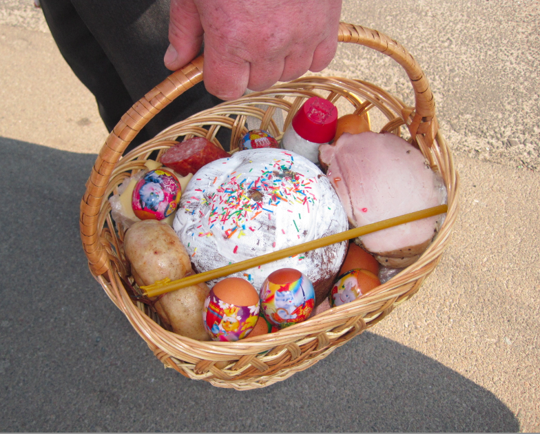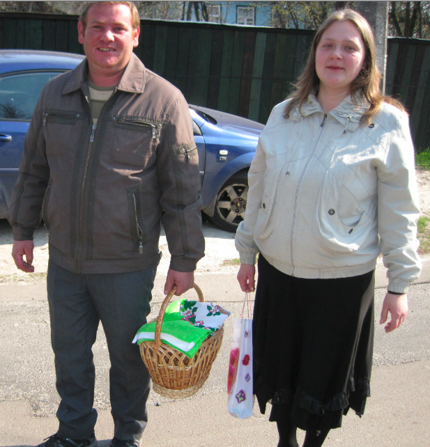Before the service, early this Sunday morning, we see a couple, basket of Easter bread and eggs in hand, wending their way toward a Ukrainian Orthodox church farther down the road. Ukrainians walk every where possible as cars are very expensive here, and today the weather is cool and gorgeous. This couple graciously allow me to photograph their beautiful paschal offering.