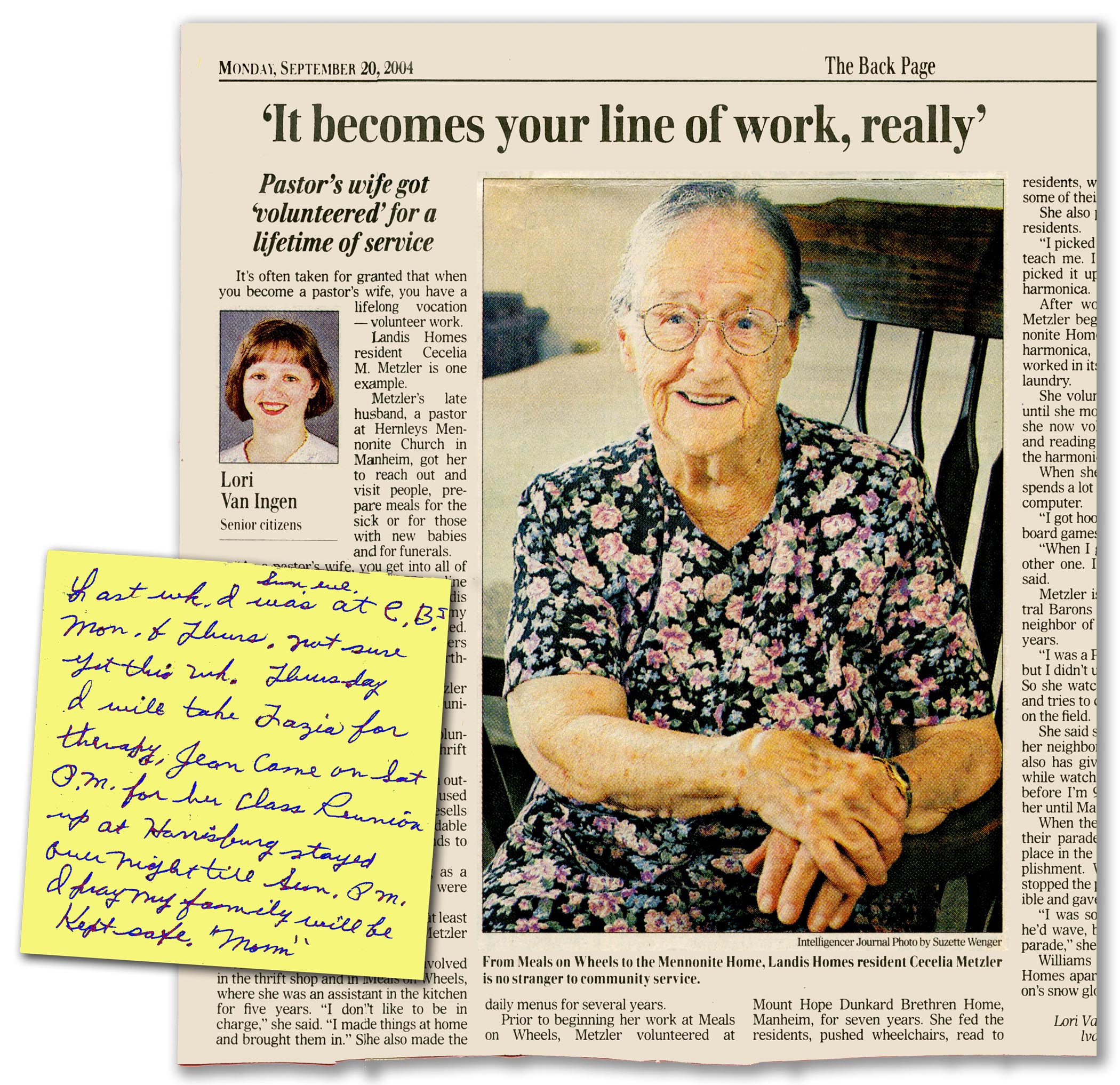 In an article that ran in the Lancaster Intelligencer Journal (Sept. 20, 2004) journalist Lori Van Ingen listed all the volunteer service that has spanned Aunt Cecilia’s life time. Mother sent this article to me with a sticky note referring to her own volunteering at C. B, Choice Books.