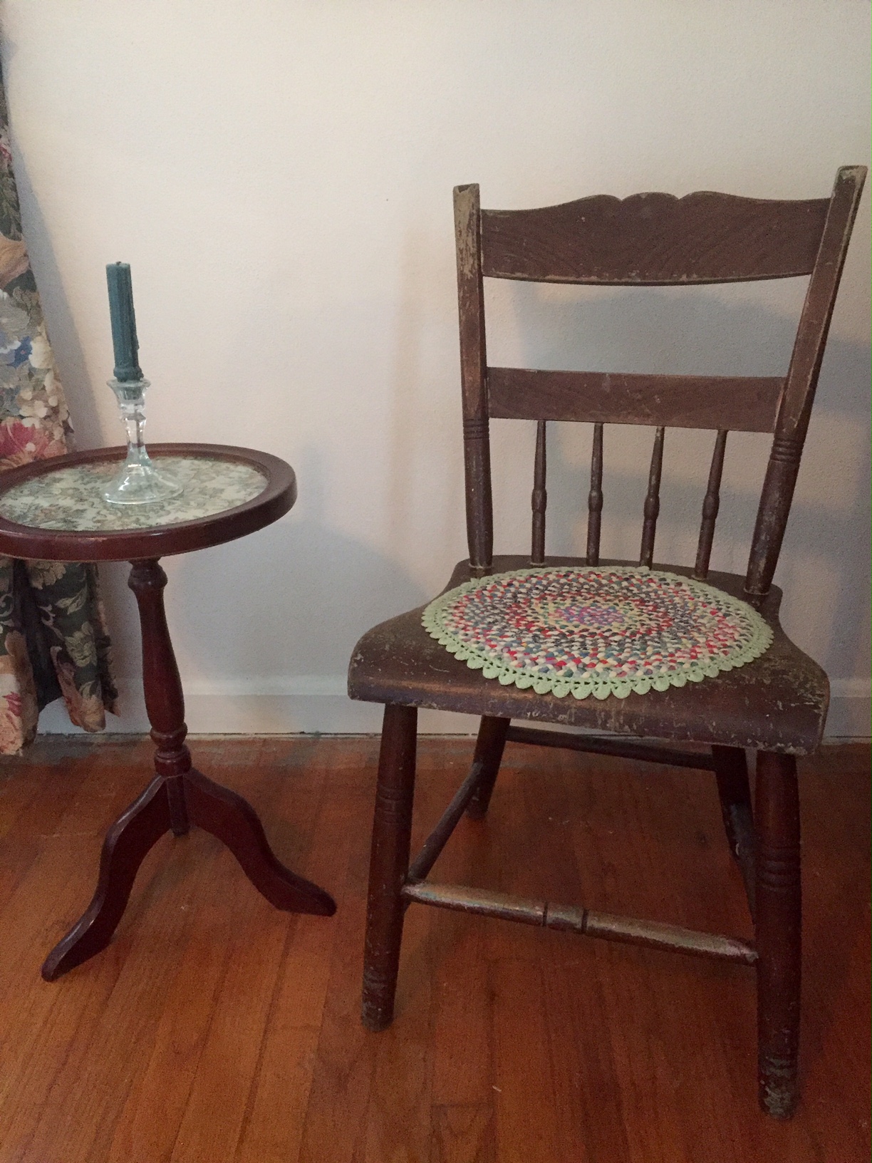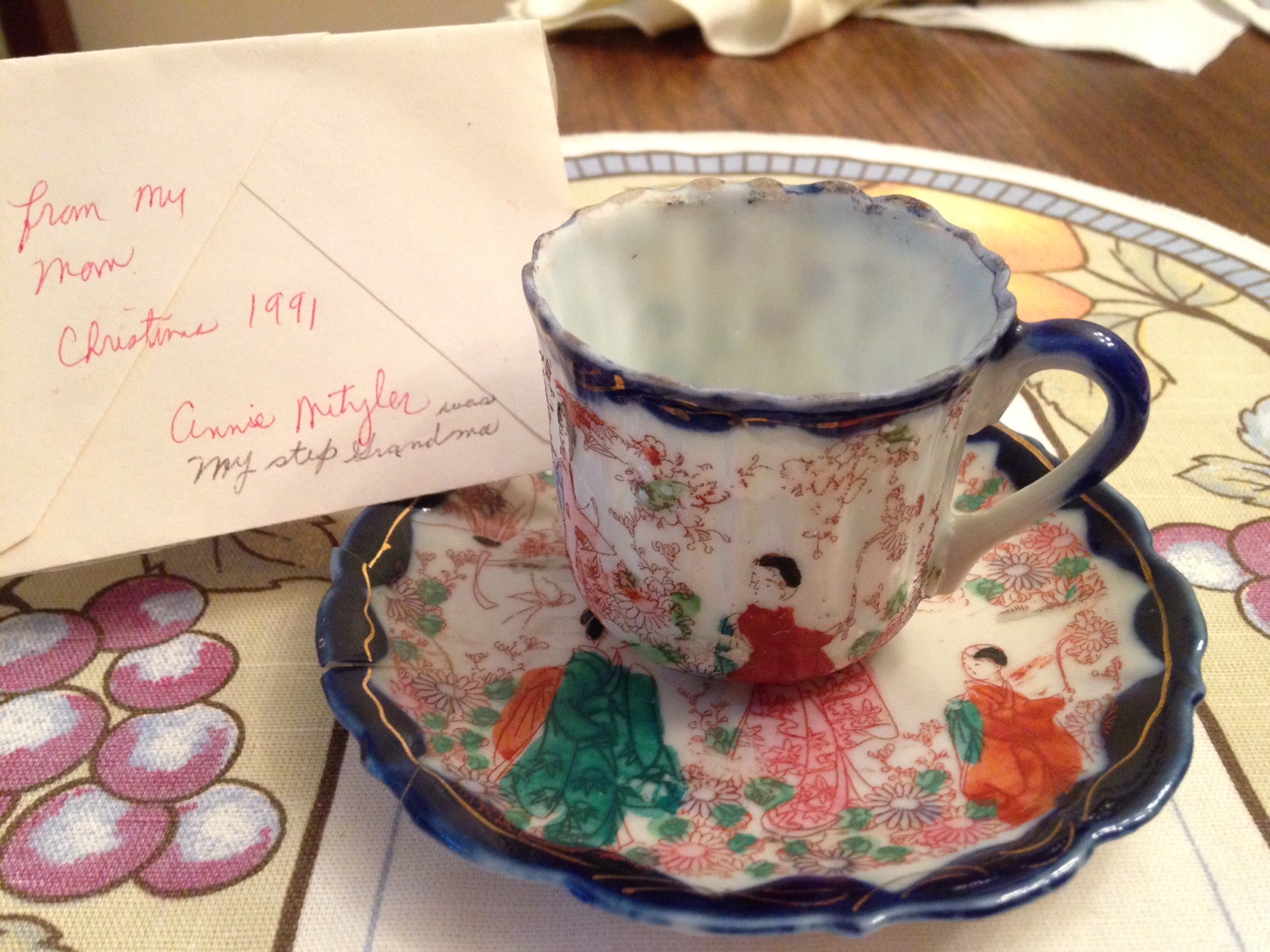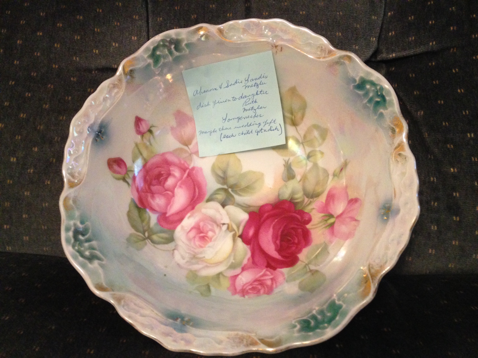 In this cropped photo, my sister Jan’s hand touches her Aunt Ruthie’s, who in turn is feeling the fake fur of a toy, who she may imagine to be her dog Fritzie.