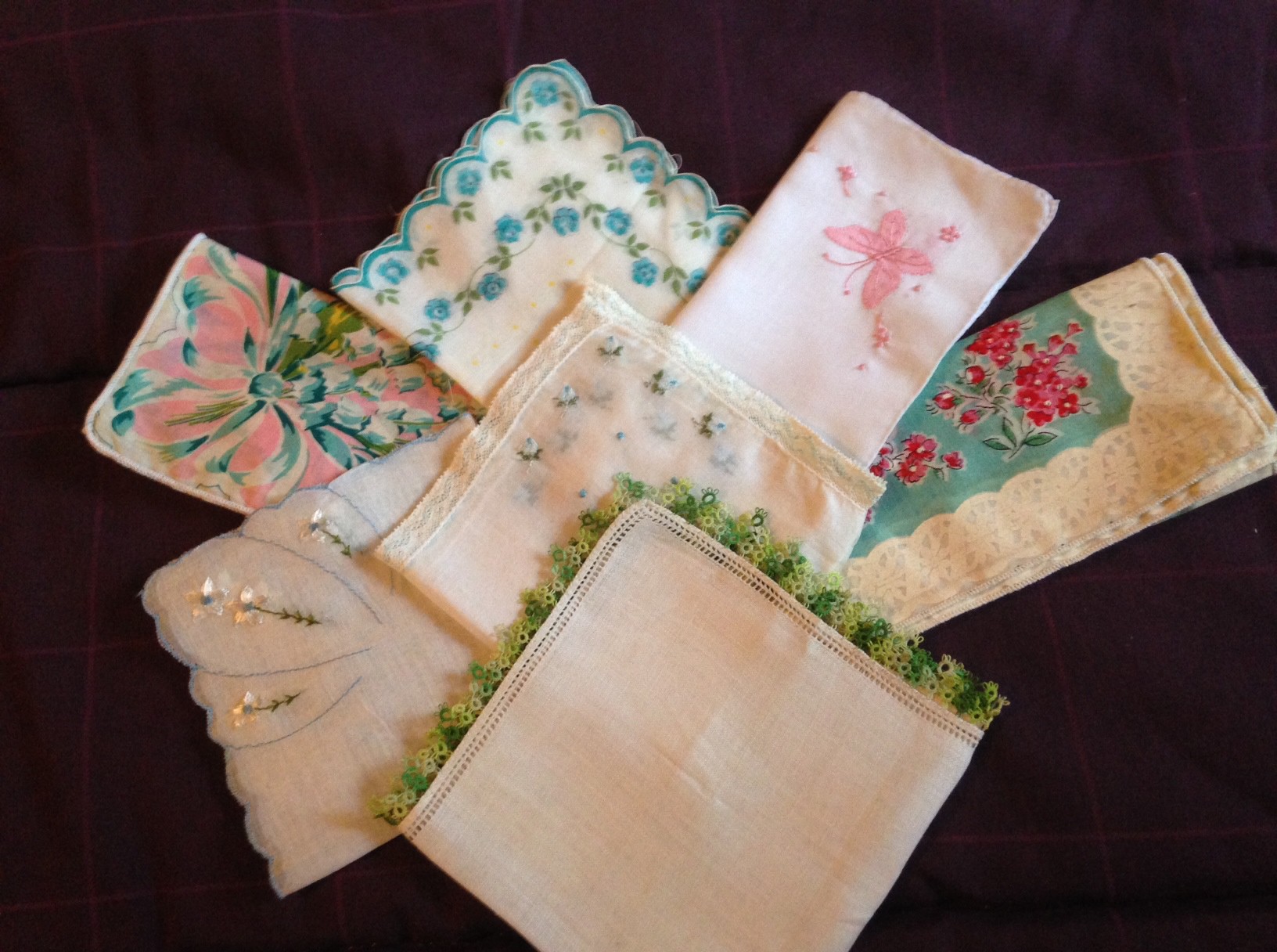 Hankies, now replaced by Kleenex, were once a part of every woman’s wardrobe. As a young child, my offering (a penny as a toddler, and later a nickel as I grew older) was tied into one corner of my white handkerchief, so I could untie the knot and put the coin into the tin box my teacher passed around during the Sunday School class. Surprisingly, Mother’s hankies were fancy, some even gaudily so, and one even boasts green tatting.