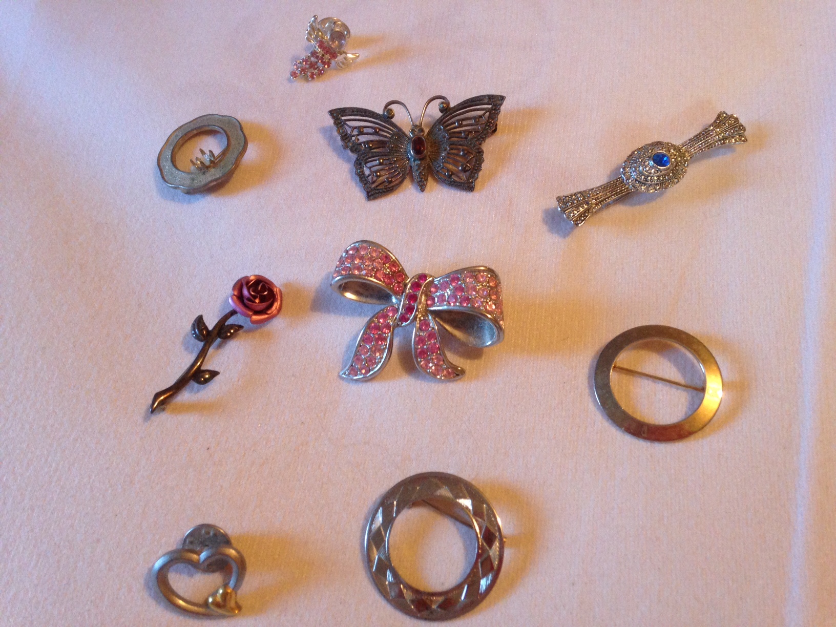 Mother never wore any jewelry except a wrist-watch, but friends bought cute little pins for her anyway. They were never all in one spot, but when we gathered them together, they numbered nine. The only one I ever remember her wearing was the round silver-faceted one, probably to her grandson Austin’s wedding.