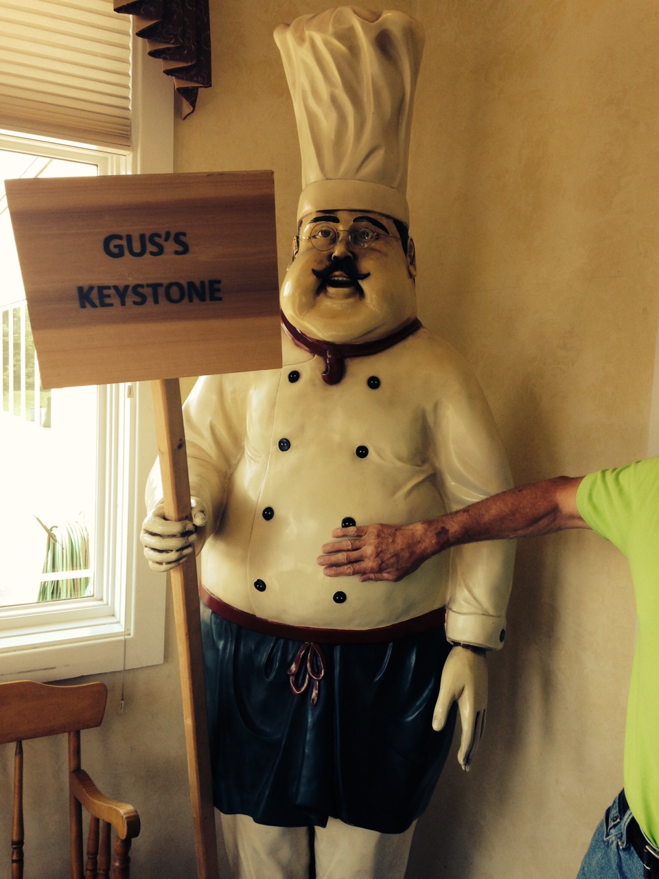 Greek Gus @ Gus’ Keystone Restaurant tweaks his menu to suit Pennsylvania Dutch palates. Dried beef gravy on mashed potatoes, Wenger’s ham loaf, pork and sauerkraut any day, and pig stomach just on Wednesdays. As I snap this photo, one obliging soul obligingly rubs the belly of the greeter.