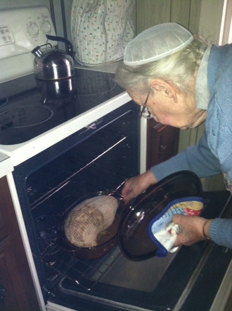 A music lover, Ruthie played the piano vigorously. If the apron is any indication, she is relaxing here after over-seeing meal making, her grand-niece Crista in the background.