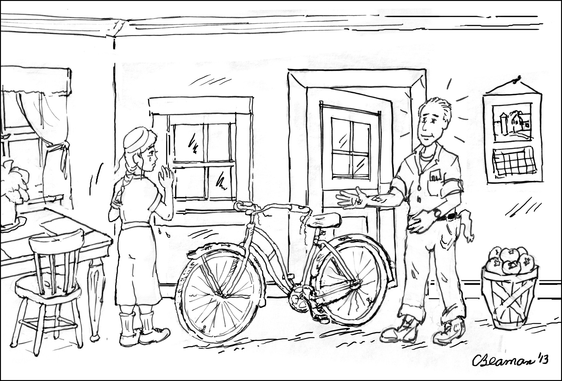 Well, there is a bike. There before me sits a beat-up, second-hand relic with dents that have not quite been hammered out under ugly, flat paint from the shelves of Longenecker Farm Supply. The shiny blue and white bicycle I’ve anticipated all these weeks has morphed into a wreck of muddy blue and dull white the color of pale dirt. The picture in my mind deflates with my dream, a balloon punctured with a rusty nail.