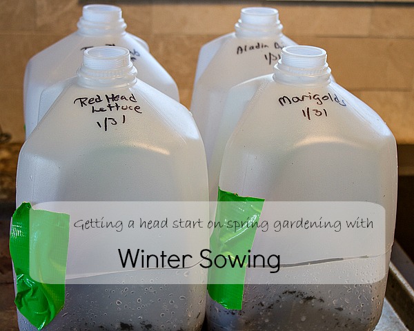 Winter sowing is placing seeds outside, in the winter, in mini-greenhouses made from things like empty milk jugs. The plastic jugs protect the seeds from harsh weather while allowing the cold to toughen them up during the cold weather. When it gets warm enough inside of the little greenhouses the seeds germinate and become viable outdoor plants sooner than those started indoors because there’s no need to harden off the plants.