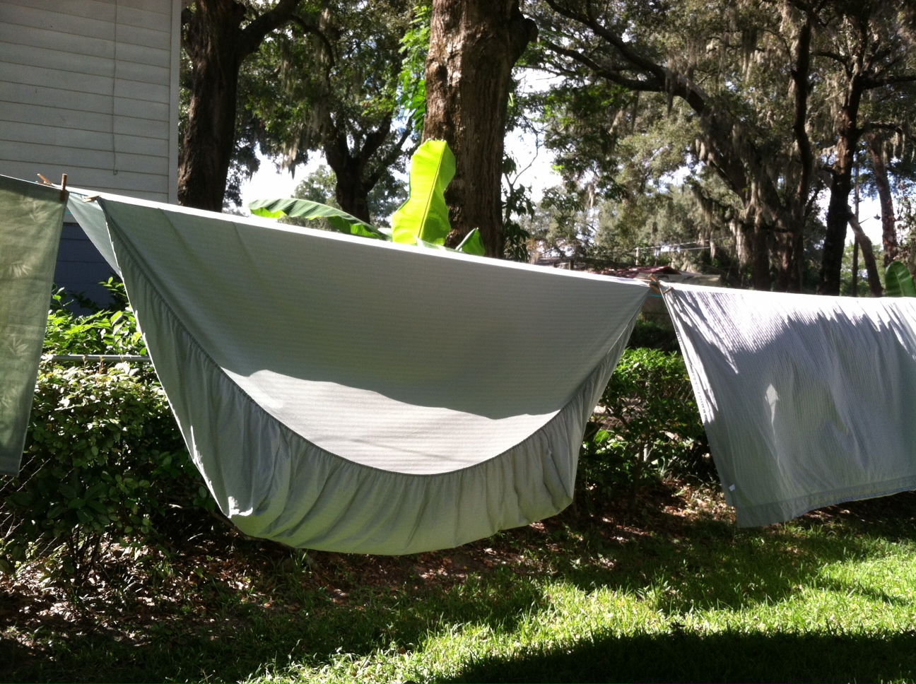When I was tall enough to reach the clothes line, I hung up wash clothes, towels, shirts, and dresses, instructed to “hide” underwear in one of the inner lines so neighbors wouldn’t see. To this day, if there is a sunny day with a breeze in Florida, I hang sheets out to dry.