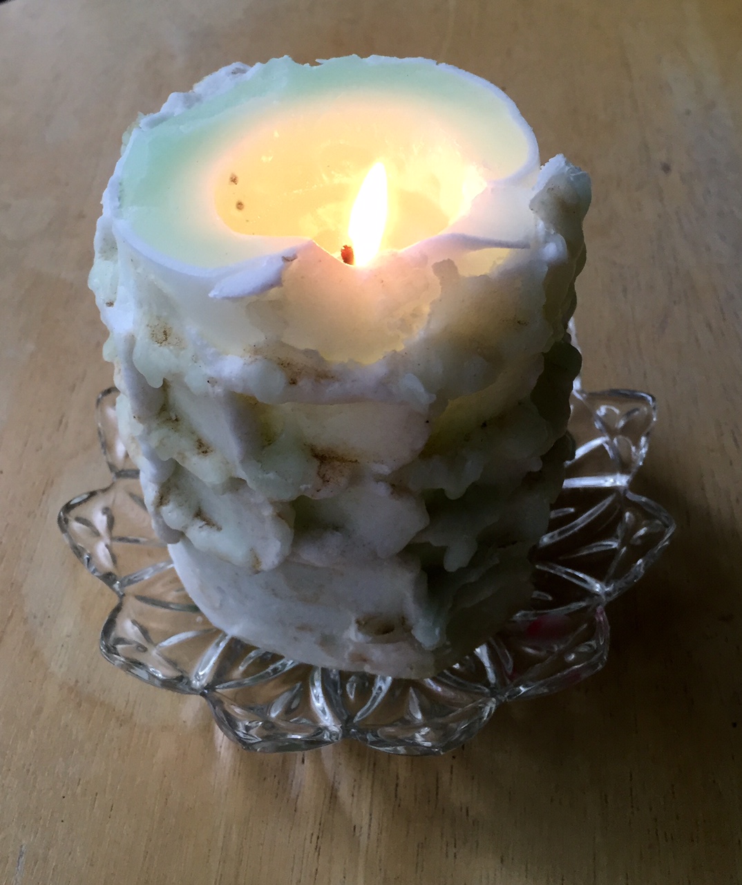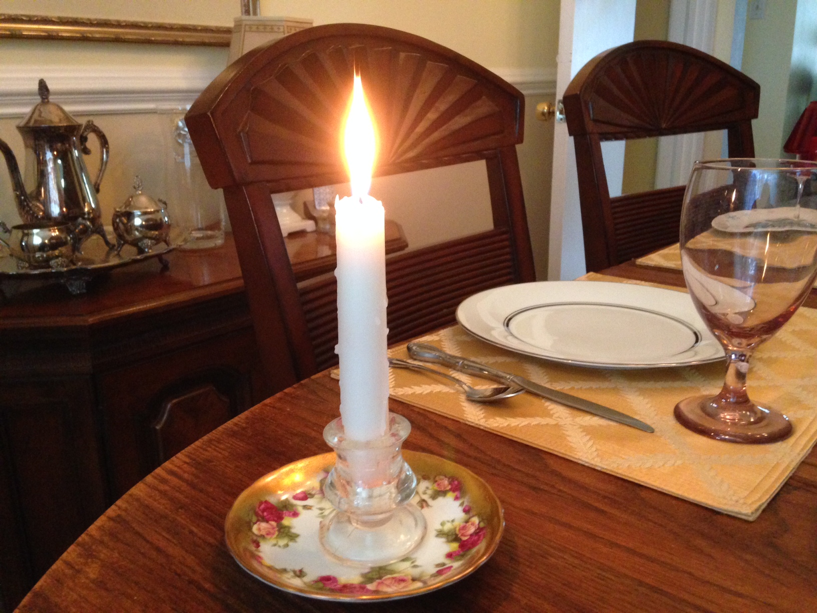This candle first flickered and then burned brightly on a pedestal at Calvary Presbyterian Church in Charlotte, North Carolina. The candle came with instructions to burn for one hour on our anniversary date. Some years the candle probably has shone for more than an hour. But we may have even skipped a year or two. Nevertheless, the long, tapered candle is very short and stubby now. Yet the flame still burns brightly.