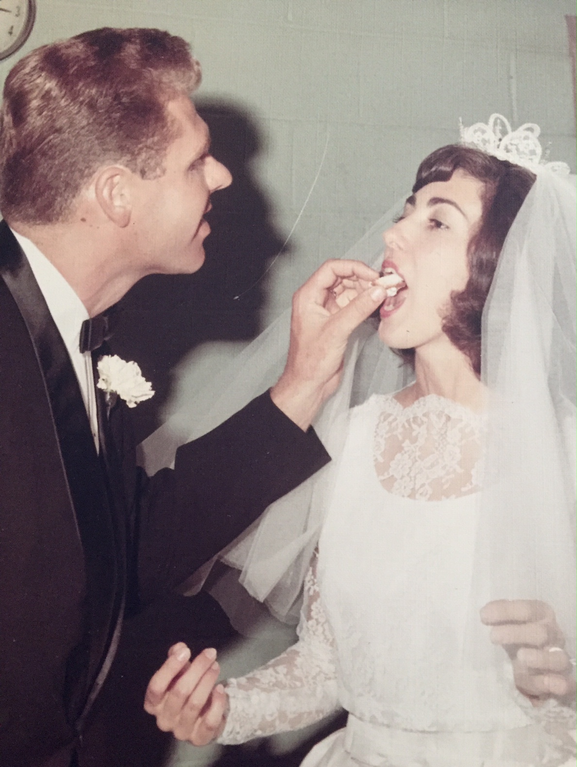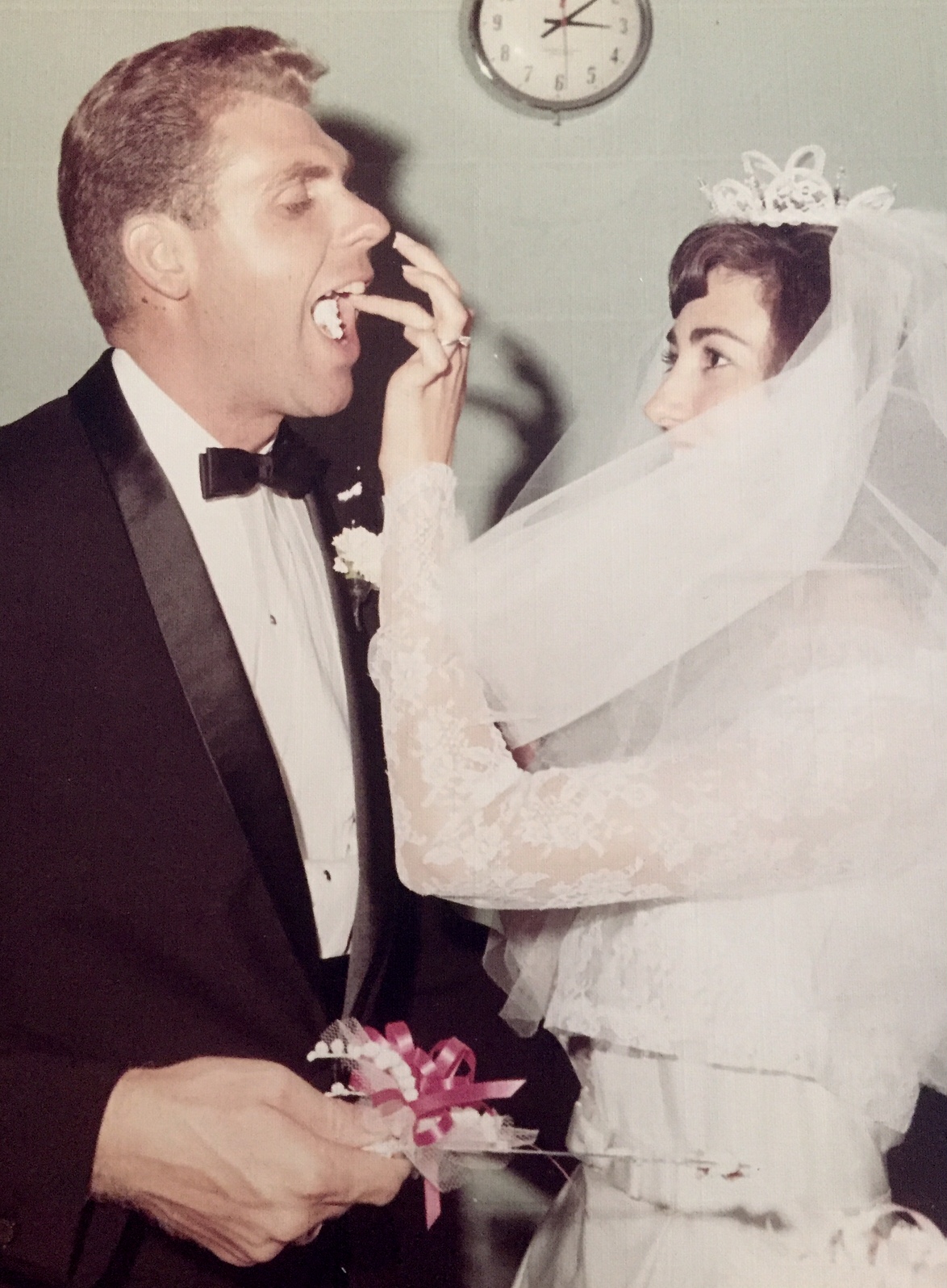 “Let them eat cake!” That’s what newly weds and their guests do at wedding receptions. At 9 ½ minutes after three o’clock on August 5, 1967, I fed my groom a huge mouthful of cake, and he returned the favor more gingerly ten seconds later, if the clock on the wall is any indication.