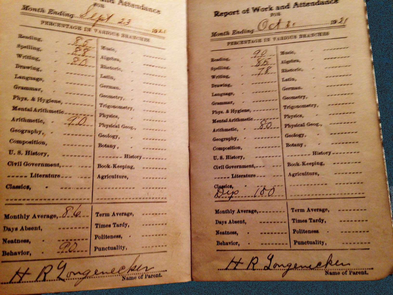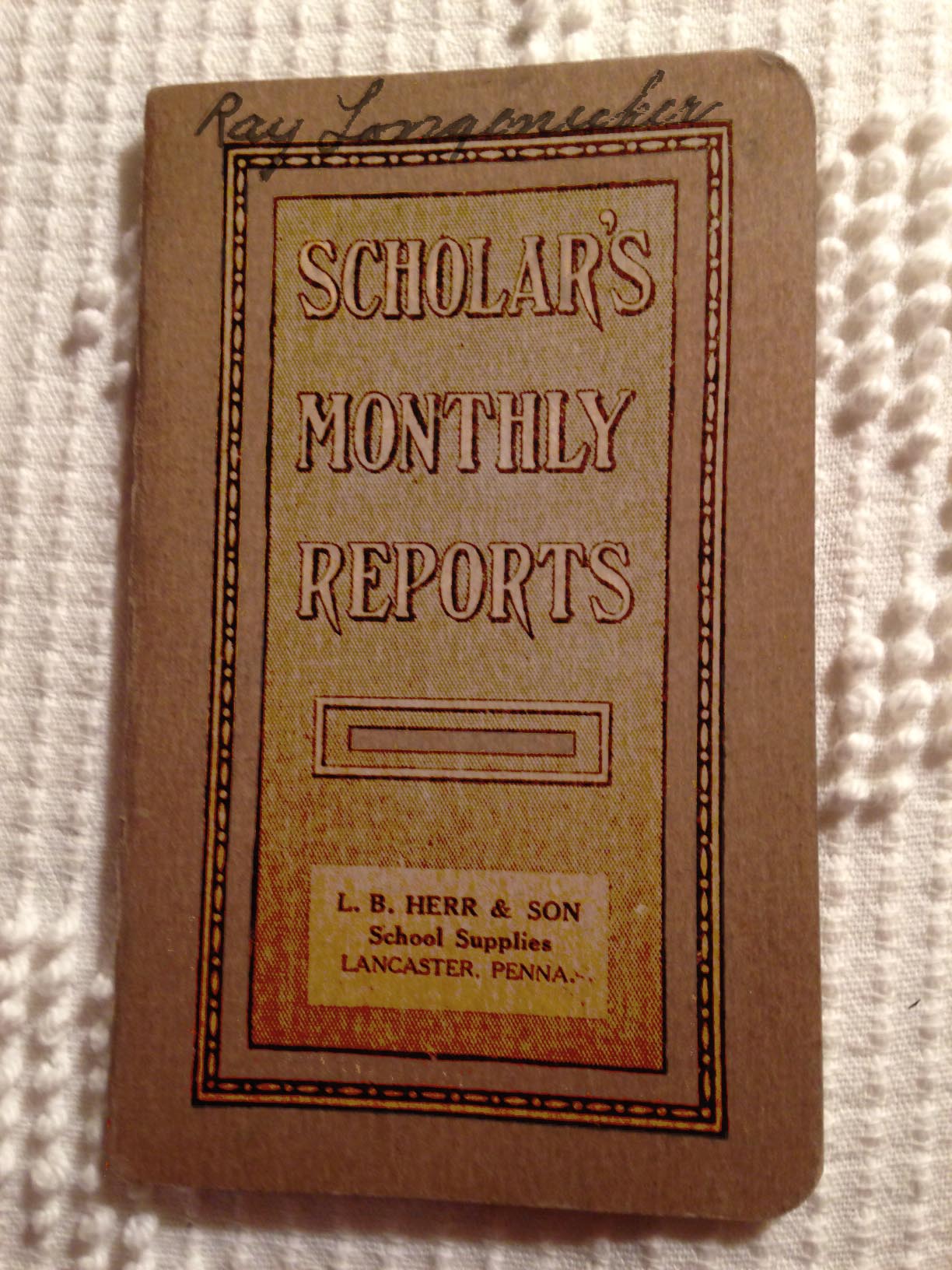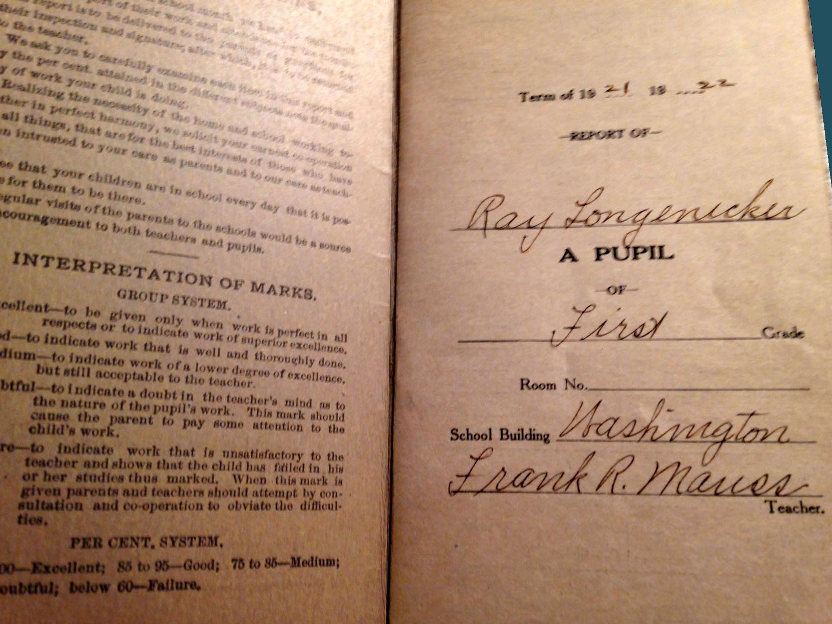 Some discoveries are hidden. Out of sight. Others are hidden in plain view. Last week we uncovered my dad’s first grade report card from 1921-22 in a box on the upper shelf of the closet. It’s a document, really, a fancy booklet with flowing cursive penmanship. The opening page announces the teacher’s name and school, Frank R. Mauss at Washington School, like many schools of the era on the same grounds as the church, in this case Bossler’s Mennonite Church.