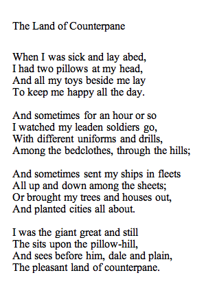 At the beginning of second grade, the summer I turned seven, I had my tonsils removed and among my memories (besides drinking chocolate milk through a straw and trying to swallow smashed bananas) is reading the poem “The Land of Counterpane” under a quilt that probably matched my own upon my sick-bed.