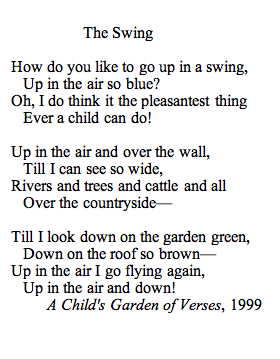 My journal tells me (and it does not lie) these are the poems by Robert Louis Stevenson that Mother recited to me in 1999 from her memories of Lime Rock School near Lititz, Pennsylvania in the mid 1920s.
