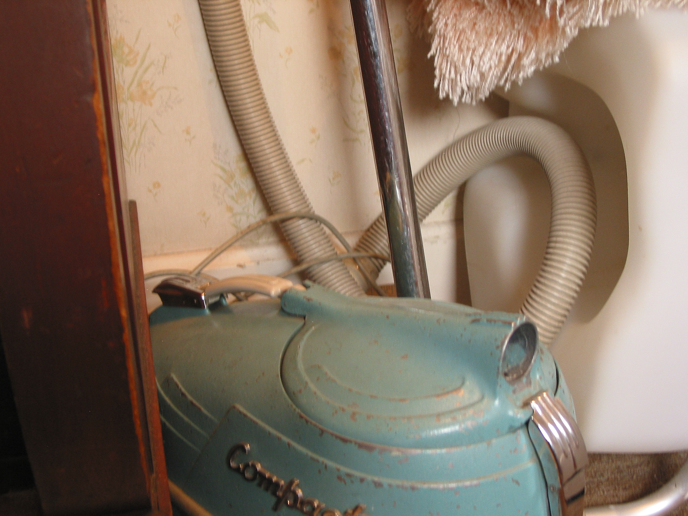 Beside the chest, her Compact vintage vacuum cleaner, a blue bullet of an animal easy to pull around the house even at her age. Her old Singer treadle sewing used to sit in the opposite corner under a window.